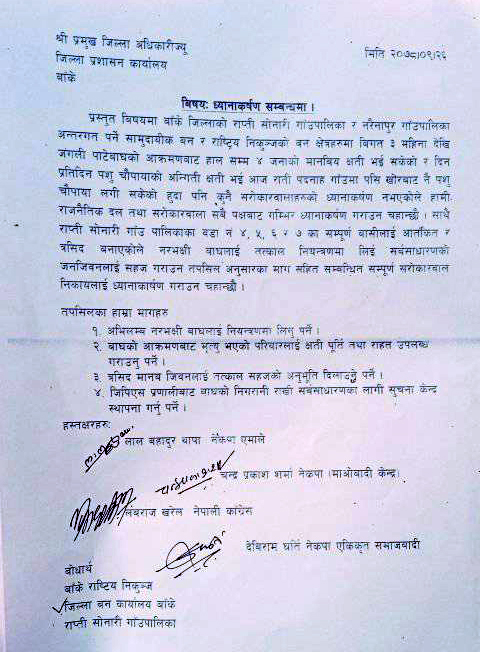 एक हप्ताभित्र २ जनाको बाघको आक्रमणबाट मृत्यु भएपछि स्थानीय त्रसिद भएका छन् ।राप्तीसोनारीका राजनीतिक दलले नरभक्षी बाघलाई तत्काल नियन्त्रणमा लिन माग गर्दै बाँकेका प्रमुख जिल्ला अधिकारीलाई सोमबार ज्ञापनपत्र बुझाएका छन् ।