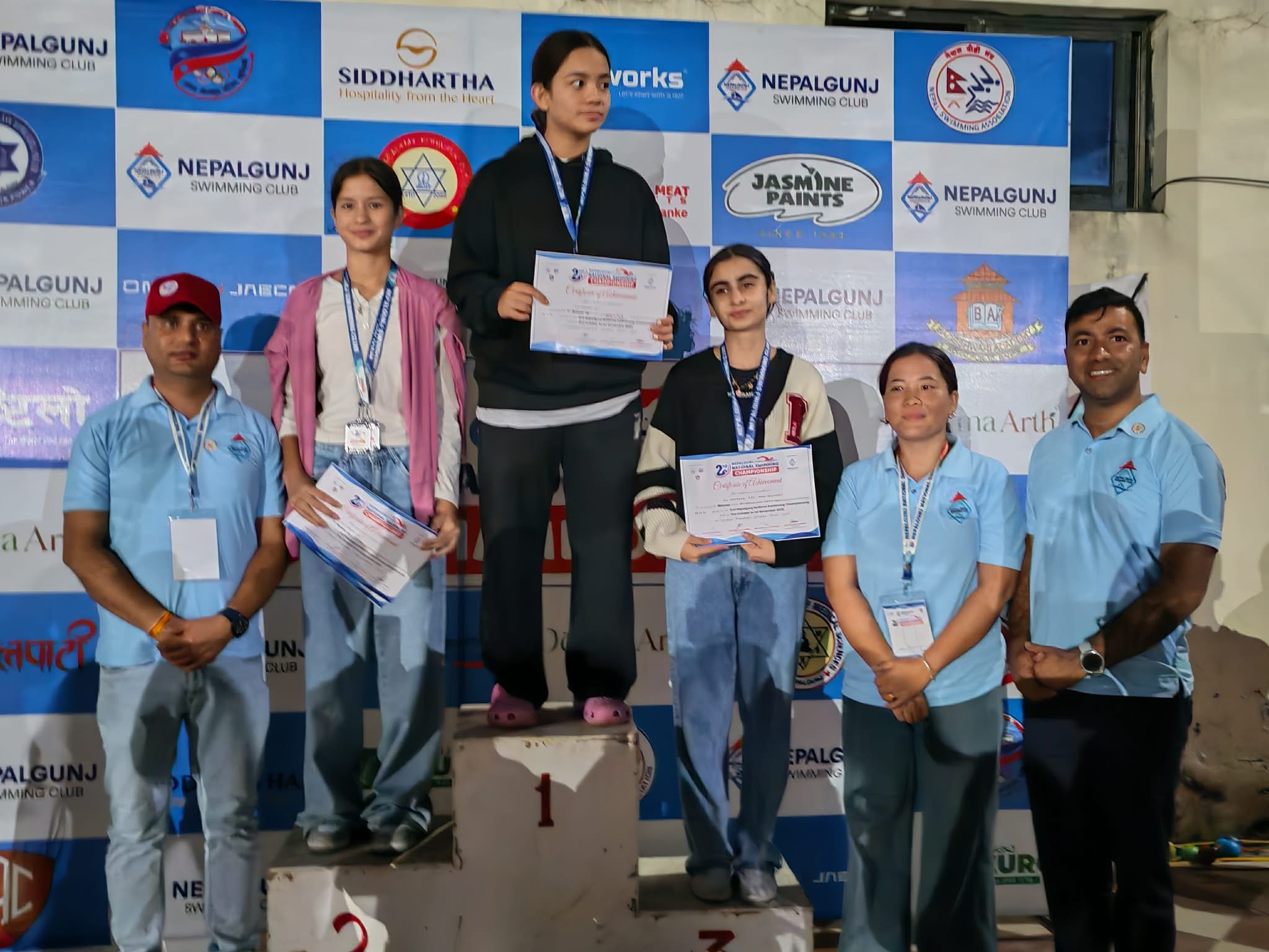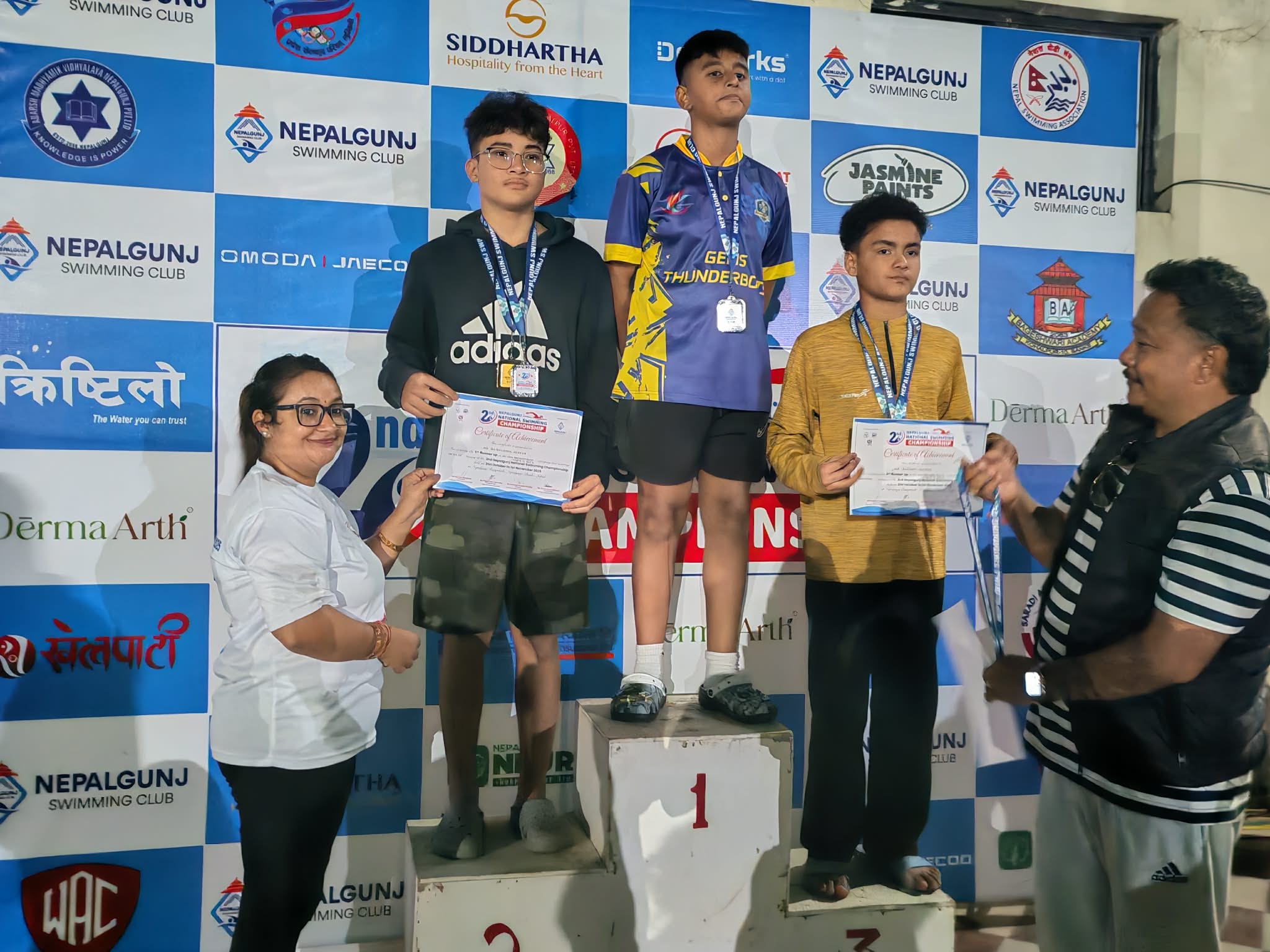 नेपालगन्ज : दोस्रो नेपालगन्ज नेशनल स्वीमिङ च्याम्पिनसीप २०२५ को पहिलो दिनको खेलमा ललितपुरको सगरमाथा स्वीमिङ क्लबले १९ स्वर्णसहित खेलमा अग्रता लिएको छ । प्रतियोगिताका प्रमुख पौडी प्राविधिक विष्णु खड्काका अनुसार शुक्रबार भएका २६ इभेन्ट मध्ये सगरमाथा क्लब एक्लैले १९ स्वर्ण, ६ रजत र ६ वटा काँस्यसहित ३१ पदक जितेर अग्रता लिएको छ । क्लबले जितेको स्वर्ण पदक मात्रै प्रतियोगिताको कूल स्वर्ण पदकको ७३ प्रतिशत हो । ललितपुरकै जेम्स स्कुलले ५ स्वर्ण, १० रजत र २ काँस्य गरी १७ पदक जितेर दोस्रो अग्रता लिएको छ ।