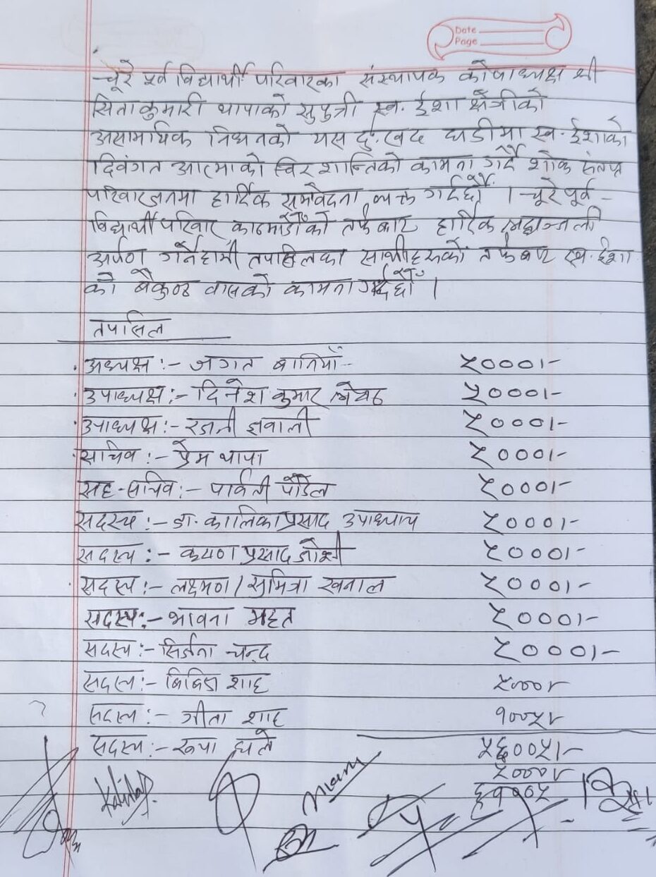 संस्थाका संस्थापक कोषाध्यक्ष सीता थापाकी छोरी ईशाको क्यान्सर रोगका कारण २५ वर्षको उमेरमा असमायिक निधन भएको सातौं दिन सोमबार चुरे पूर्वविद्यार्थी परिवारका उपाध्यक्ष दिनेशकुमार श्रेष्ठ नेतृत्वको टोलीले गौशालास्थित पशुपति किरिया घर पुगर श्रद्धाञ्जली अर्पण गरेका हुन् ।