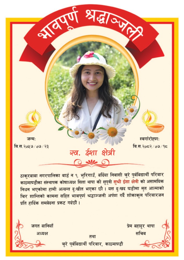 काठमाडौं : चुरे पूर्वविद्यार्थी परिवार काठमाडौंले स्वर्गीय ईशा क्षेत्रीलाई श्रद्धाञ्जली अर्पण गरेको छ ।