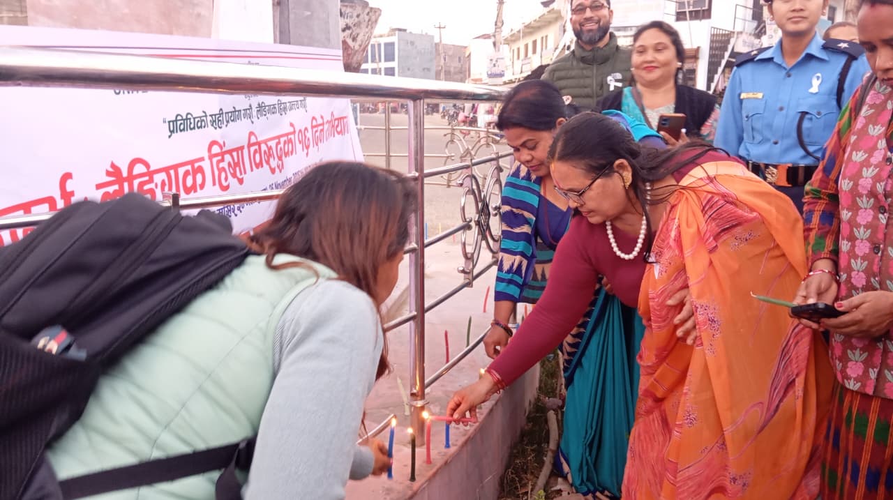 यसै क्रममा मंगलबार साँझ ५ बजे राधाकृष्ण चोकमा दीप प्रज्वलन गरिएको अभियान संयोजक उप मेयर सावित्रा गौतमले बताइन् । दीप प्रज्वलनमार्फत लैङ्गिक हिंसाका विरुद्ध एकता, आशा र न्यायको प्रकाश फैलाउने सन्देश दिन लागिएको गौतमले बताइन् ।
