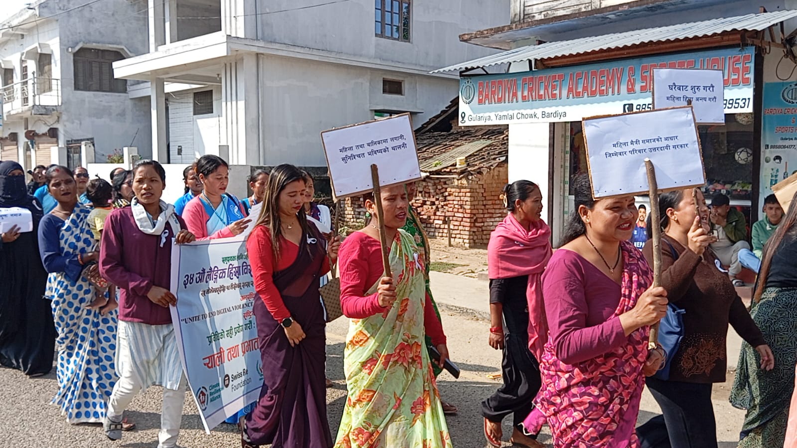 लैङ्गिक हिंसाबिरुद्धको १६ दिने अभियान अन्तर्गत मंगलबार बर्दियाको गुलरियामा र्याली र दीप प्रज्वलन गरिएको छ । गुलरिया नगरपालिका भवनबाट बिहान ११ बजे निकालिएको सचेतनामूलक र्यालीले नगर परिक्रममा गरेको थियो । र्यालीका क्रममा सहभागीहरूलाई सेतो रिबन वितरण गरी लैङ्गिक हिंसाबिरुद्ध एकताबद्ध सन्देश प्रवाह गरिएको थियो। नगर परिक्रमापछि र्याली पुनः नगरपालिका परिसरमै आइपुगेपछि कोणसभा गरिएको थियो ।