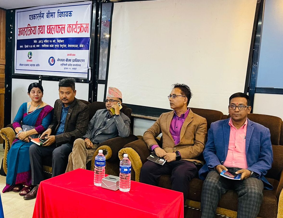 नेपाल बीमा प्राधिकरण बुटवल कार्यालयकी निर्देशक जमुना अर्यालको अध्यक्षता सम्पन्न कार्यक्रममा प्रमुख अतिथि नेपाल पत्रकार महासंघ लुम्बिनी प्रदेश अध्यक्ष शुक्रऋषि चौलागाई, सार्वजनिक सेवा प्रसारण नेपाल, नेपाल टेलिभिजन कोहलपुर प्रमुख निराजन खनाल, नेपाल पत्रकार महासंघ बाँकेका अध्यक्ष नवीन गिरी, नेपाल इन्स्योरेन्स प्रोफेसनल्स सोसाइटी बाँकेका अध्यक्ष सिद्धान्तजंग शाह, पत्रकारहरु निरज गौतम, शंकरप्रसाद खनाल, शरण कर्माचार्य, करुणा शाह, सावित्री गिरी, माधव अधिकारी, लोकनाथ शर्मा, बैकुण्ठप्रसाद अधिकारी लगायतले बीमा सम्बन्धि आफ्ना अनुभवसहित विभिन्न सुझाव र पृष्ठपोषण दिएका थिए । कार्यक्रमको सहजीकरण नेपाल बीमा प्राधिकरण बुटवलका बलराम गिरीले गरेका थिए । कार्यक्रममा नेपालगन्जमा क्रियाशील पत्रकार र विभिन्न बीमा कम्पनीका प्रमुख एवं प्रतिनिधिहरुको पनि उपस्थिति रहेको थियो ।