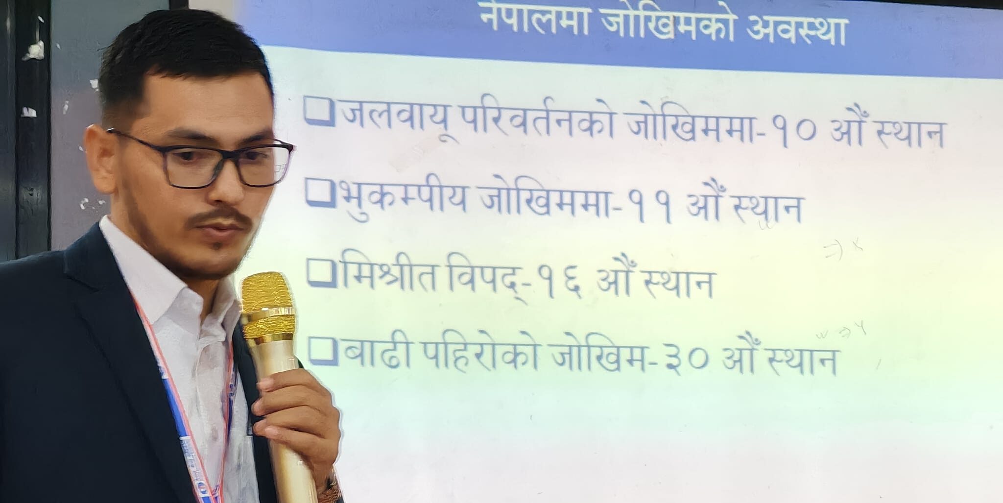 सहायक निर्देशक विसीले नेपालमा जोखिमको अवस्था रहेको भन्दै नेपाल जलबायु परिवर्तनको जोखिममा १०औं, भूकम्पीय जोखिममा ११औं, मिश्रित विपद् १६औं र बाढी पहिरोको जोखिमका हिसाबले विश्वमा ३०औं स्थानमा रहेको जानकारी गराए ।