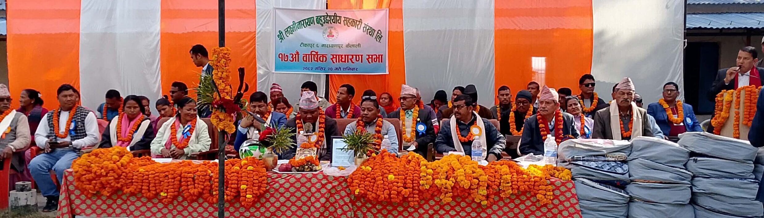 सहकारी संस्थाका अध्यक्ष कपुरसिंह कडायतको अध्यक्षतामा भएको वार्षिक साधारणसभालाई सम्बोधन गर्दै टीकापुर नगरपालिकाका नगर प्रमुख रामलाल डगौरा थारुले लक्ष्मीनारायण सहकारील्र सामाजिक क्षेत्रमा उदाहरणीय काम गर्दै आएको बताउँदै सहकारीले कृषि क्षेत्रका लागि मलखादको व्यवस्था गरि राम्रो काम गरेको भनेर प्रशंशा गरे । गत आर्थिक वर्ष टीकापुर नगरपालिका वडा नं. को आर्थिक सहयोगमा निर्माण कार्य शुरु भएर अधुरो भवनको निर्माण कार्य नगरपालिका पालिकाले सम्पन्न गर्ने उनले प्रतिबद्धता जनाए ।