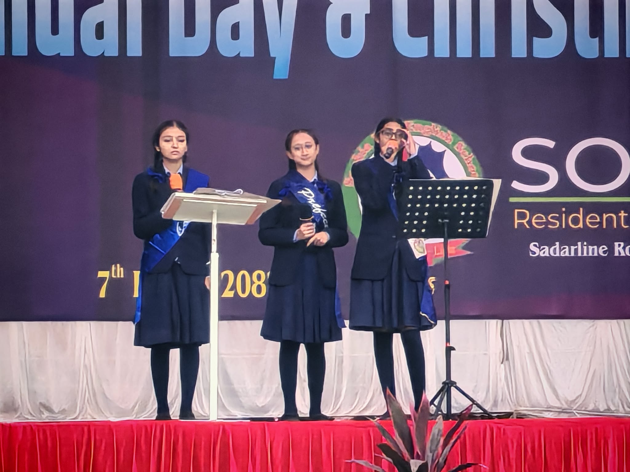 कुनै औपचारिक कार्यक्रममा कति जना उद्घोषक हुन्छन् ? एउटा, दुई वटा कि बढीमा तीन वटा ? बाँकेको सोफिया रेसिडेन्सिय स्कुलको आइतबार नेपालगन्जमा सम्पन्न २१औैं वार्षिकोत्सव तथा क्रिसमस उत्सव २०२५ मा तपाईले कल्पनै नगरेको संख्यामा उद्घोषक थिए । हेर्दा सानासाना नानीबाबु जस्ता थिए तर उनीहरुले व्यावसायिक उद्घोषक जस्तै बेजोड प्रस्तुती दिए । हरेक इभेन्टमा तीन तीन जनाका दरले उद्घोषक मञ्चमा आउँथे । एउटा उद्घोषकले सुरुमा अंग्रेजीमा बोल्थ्यो । त्यही कुरा अर्को उद्घोषकले नेपालीमा भनिदिन्थ्यो । अन्तिममा तेस्रोले हिन्दी भाषामा दर्शक रुपी अभिभावकले बुझ्ने गरी बोल्थ्यो । यो श्रृङ्खला एक पटक होइन, दुई पटक होइन, कार्यक्रमका ४५ वटा इभेन्टमा फरक फरक उद्घोषक थिए । सबैले मन्त्रमुग्ध पार्दै उद्घोषण गरेर गएका थिए । कक्षा ९ देखि ११ कक्षाका २३ जना विद्यार्थीले उद्घोषकको भूमिका निर्वाह गरेका थिए ।स्मारिका बुढा (कक्षा १०), श्रीयांश सिंह केसी (कक्षा ९), भाष्कर पोखरेल (कक्षा १०), प्रनिश थापा (कक्षा १०), एन्डु वर्णवास धिताल (कक्षा १०), शिवेश देव (कक्षा १०), क्याथरिन यमि बसेल (कक्षा १०), वैभवी सोनी (कक्षा ९), आराध्या गुुप्ता (कक्षा ९) र उत्साह श्रेष्ठ (कक्षा १०)ले अंग्रेजी भाषामा एंकरिङ (उद्घोषण) गरेका थिए । उनीहरुले प्रयोग गरेको भाषाशैली कुनै व्यवसायिक उद्घोषक भन्दा कम्ती थिएन ।