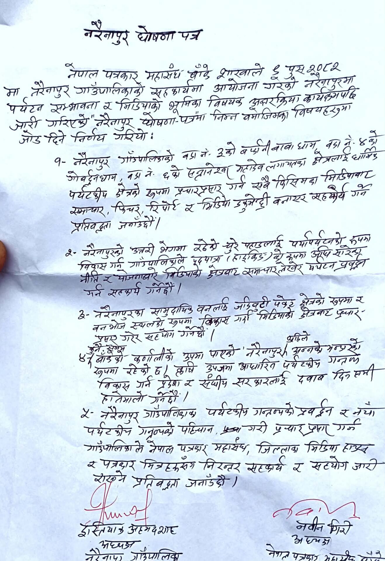 घोषणा पत्रमा नरैनापुर क्षेत्रमा रहेका धार्मिक पर्यटकीय क्षेत्रको रुपमा प्रचार–प्रसार गर्न सबै किसिमका मिडियाबाट समाचार, फिचर, रिपोर्ट र भिडियो डकुमेन्ट्री बनाएर सहकार्य गर्ने, नजिकै रहेको चुरे पहाडलाई पर्यापर्यटनको रुपमा विकास गर्न गाउँपालिकाले पदयात्रा (हाइकिङ) को रुपमा अघि सारेका नीति र योजनाबारे मिडियाको क्षेत्रबाट समाचार लेखेर पर्यटन प्रवद्र्धन गर्न सहकार्य गर्ने, नरैनापुर गाउँपालिकाका पर्यटकीय गन्तब्यको प्रबर्द्धन र नयाँ पर्यटकीय गन्तब्यको पहिचान गरी प्रचार–प्रसार गर्न गाउँपालिकाले नेपाल पत्रकार महासंघ, जिल्लाका मिडिया हाउस र पत्रकारहरुसँग निरन्तर सहकार्य र सहयोग जारी राख्ने लगायत बुँदाहरु रहेका छन् ।