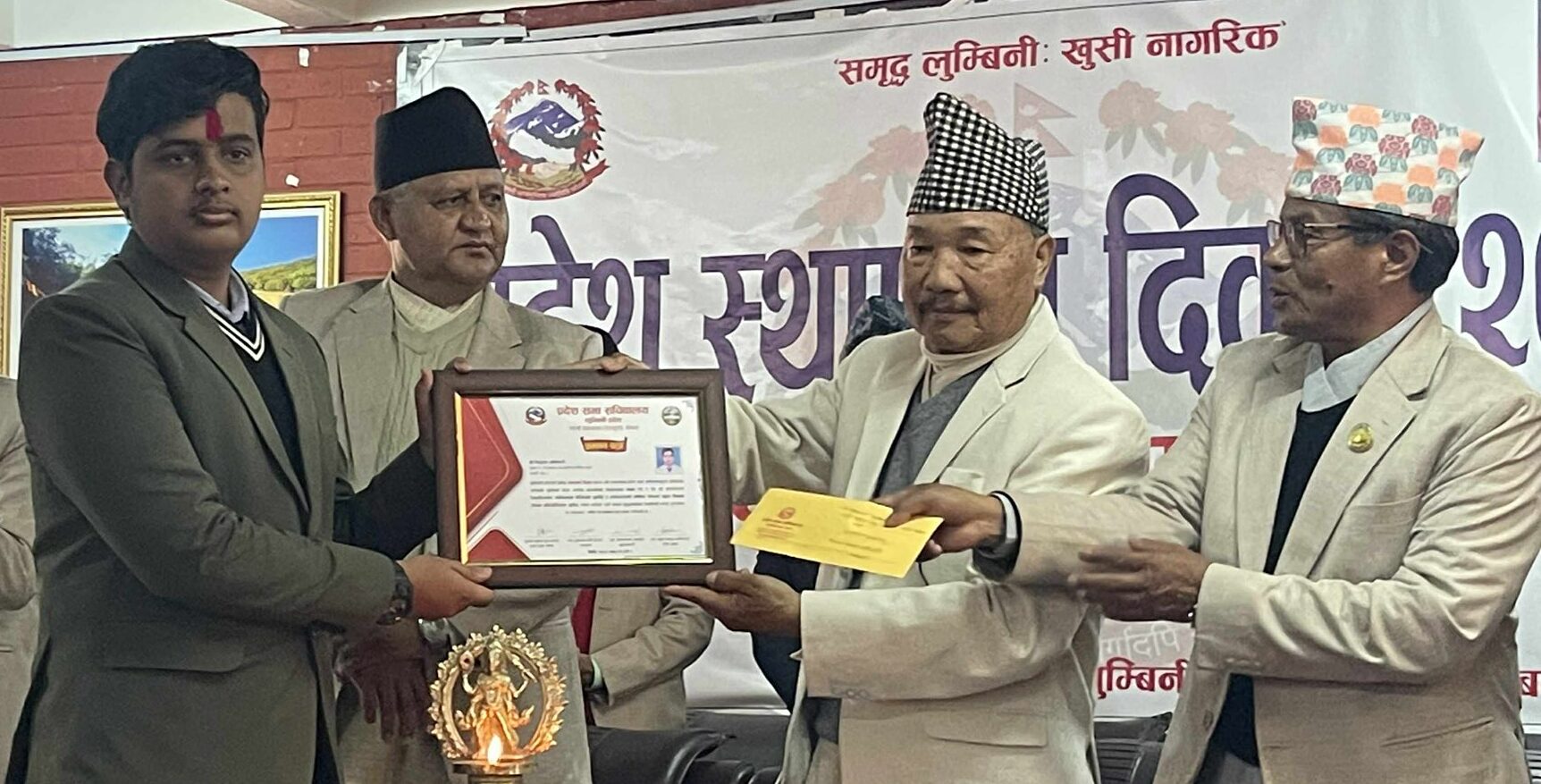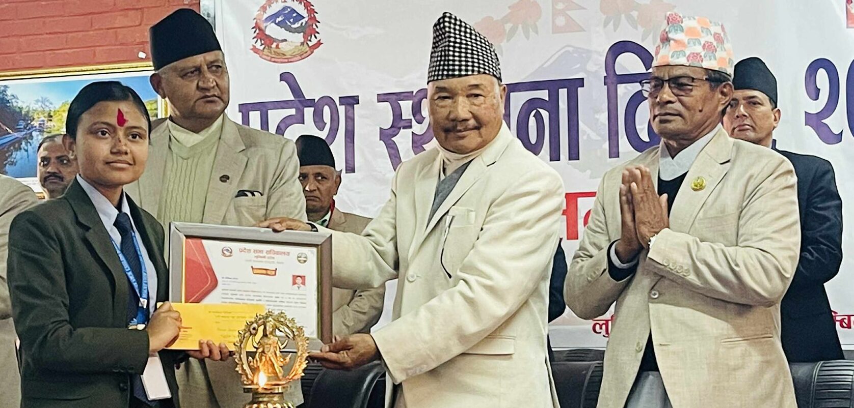 लुम्बिनी प्रदेश प्रमुख कृष्णबहादुर घर्तीमगरले विजेता तीनै जनालाई पुरस्कार तथा प्रमाणपत्र वितरण गरेका थिए । लुम्बिनी प्रदेश प्रमुख कृष्णबहादुर घर्तीमगरले बुधबार राप्ती उपत्यका (देउखुरी)मा ९औं प्रदेश स्थापना दिवसको उद्घाटन गरेका हुन् ।